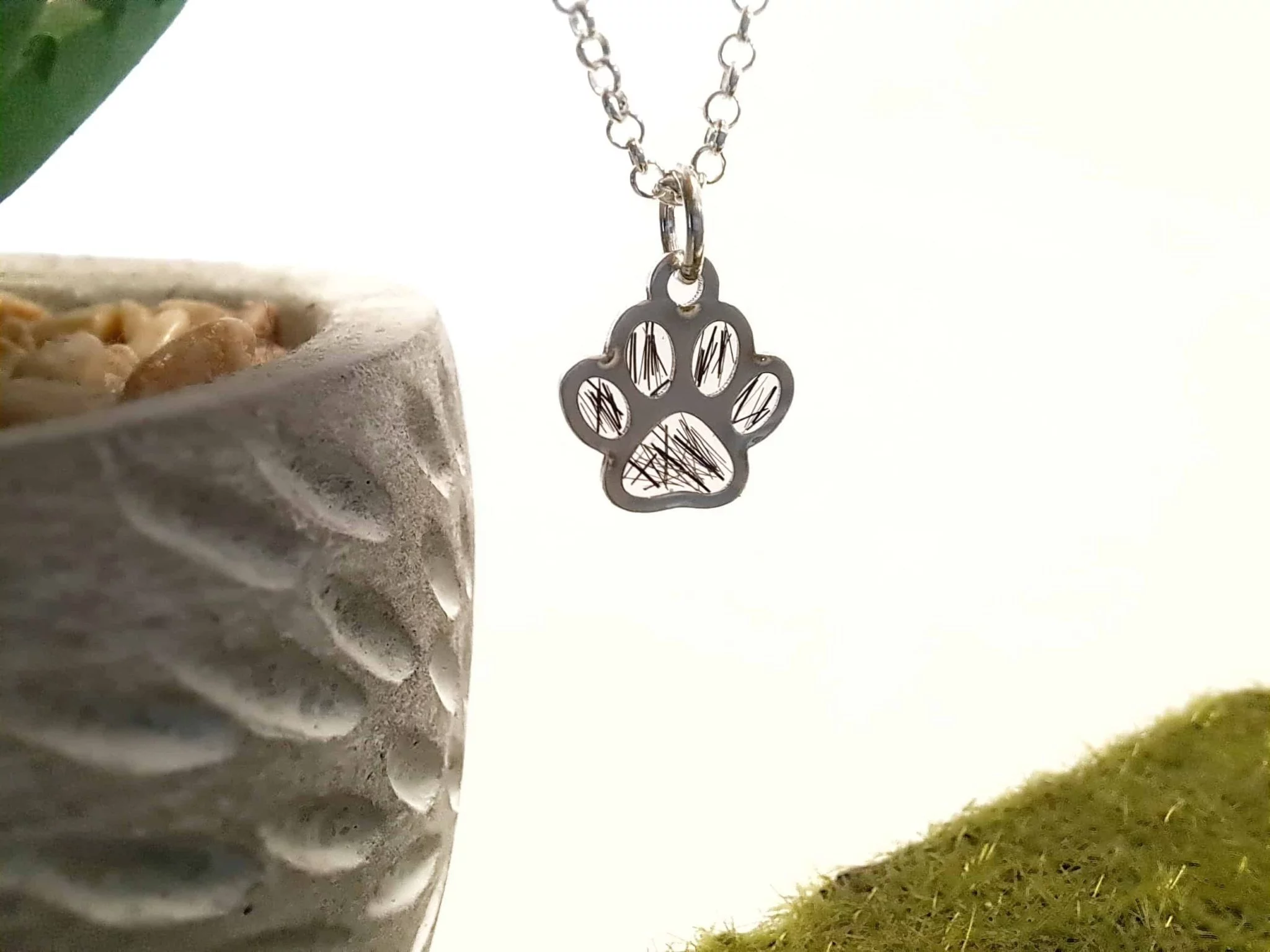 Minimalistyczny naszyjnik w kształcie łapki z zamkniętą w środku sierścią lub prochami zwierząt. Całość wykonana ze srebra (próba 925). To idealna propozycja dla kobiet ceniących sobie delikatną i subtelną biżuterię, która ma stanowić pamiątkę po zwierzęcym przyjacielu.