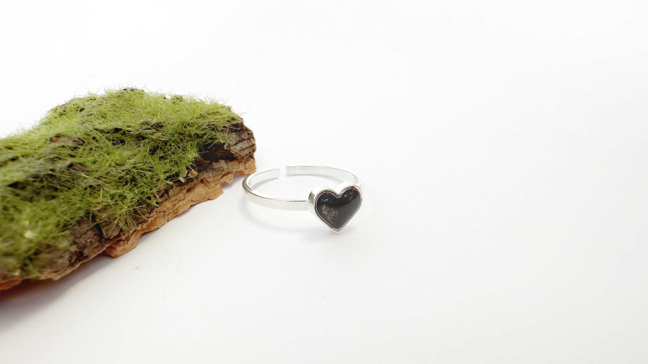 Pierścionek z oczkiem w kształcie serduszka o wymiarach 7 x 7 mm. Wewnątrz w żywicy zatopione prochy lub sierść zwierząt. Obwód pierścionka regulowany, wykonany ze srebra próby 925.